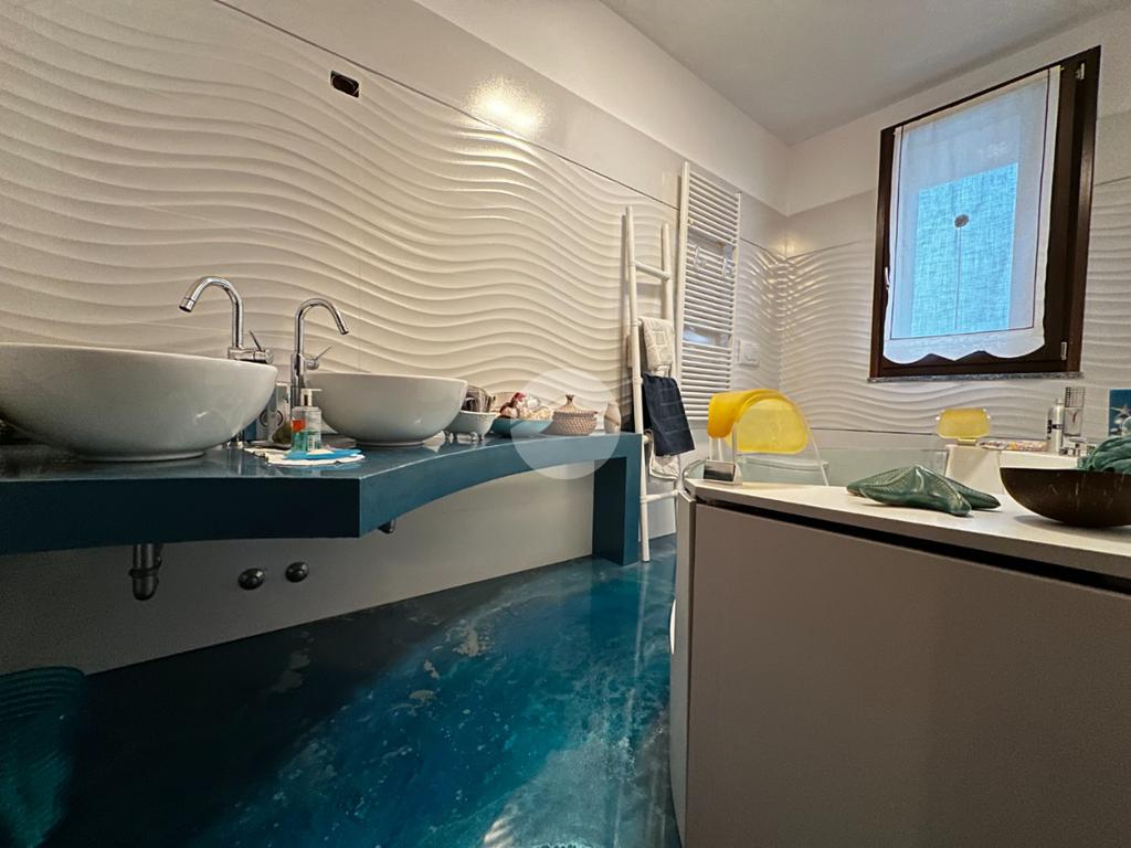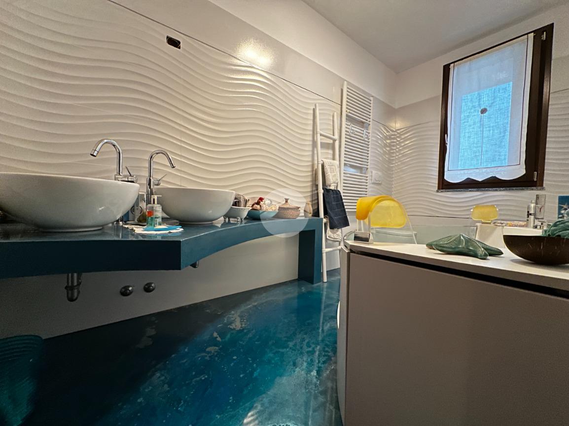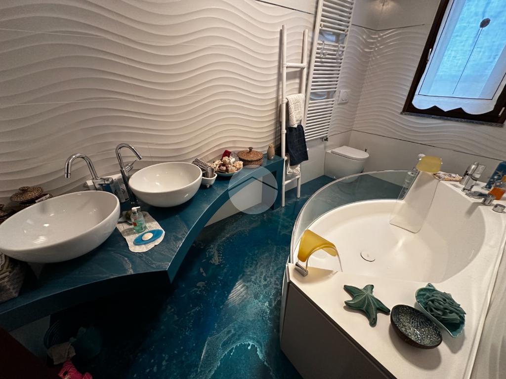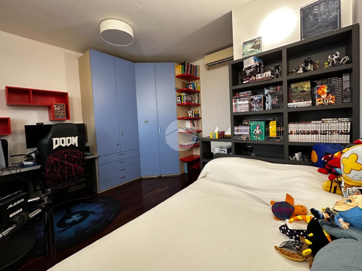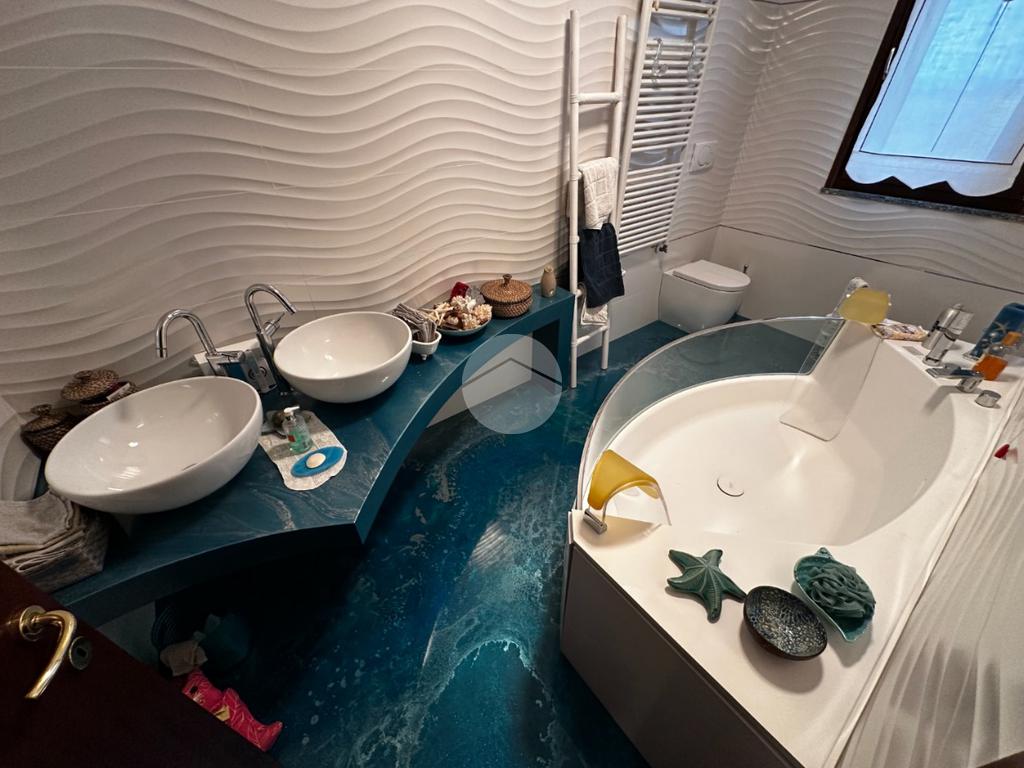 La zona notte comprende tre camere da letto, di cui una matrimoniale con cabina armadio e bagno privato finestrato con doccia, oltre a un ulteriore balcone. Completa l’abitazione un elegante bagno padronale con vasca idromassaggio, rifinito con materiali di pregio e pavimentazione in resina.