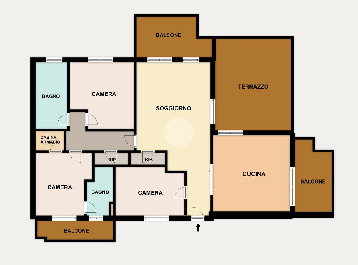 L’ingresso conduce a un ampio soggiorno rettangolare che si apre su un balcone coperto e su un terrazzo di grandi dimensioni, perfetto per creare una zona relax e pranzo all’aperto in totale privacy. Cuore della casa è la splendida cucina, sorprendentemente spaziosa e di forma regolare, che consente di arredare comodamente le pareti e di collocare al centro un grande bancone con tavolo in stile americano, ideale per vivere momenti conviviali in famiglia o con gli amici. La cucina gode inoltre di un accesso diretto non solo al terrazzo, ma anche a un ulteriore balcone coperto, perfetto come spazio di servizio o angolo verde riservato.