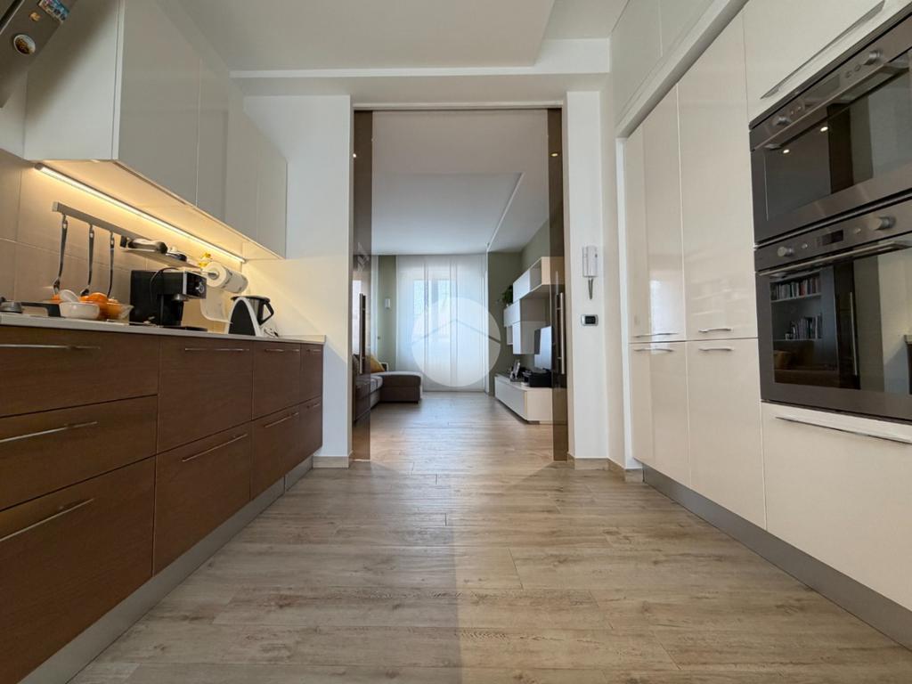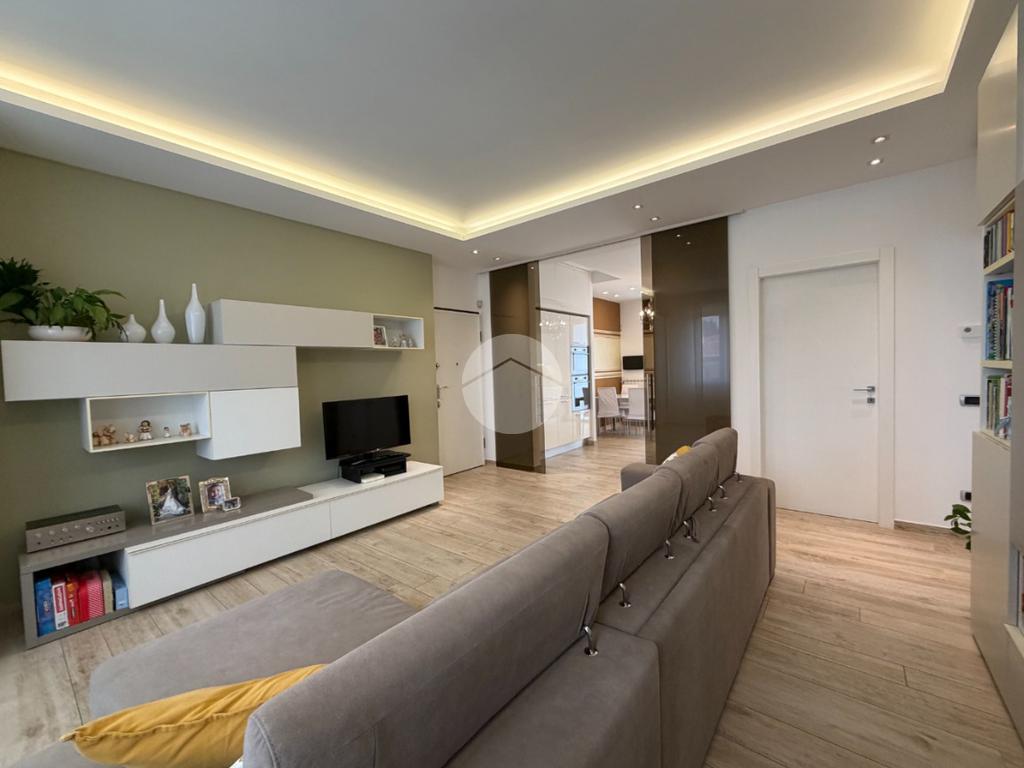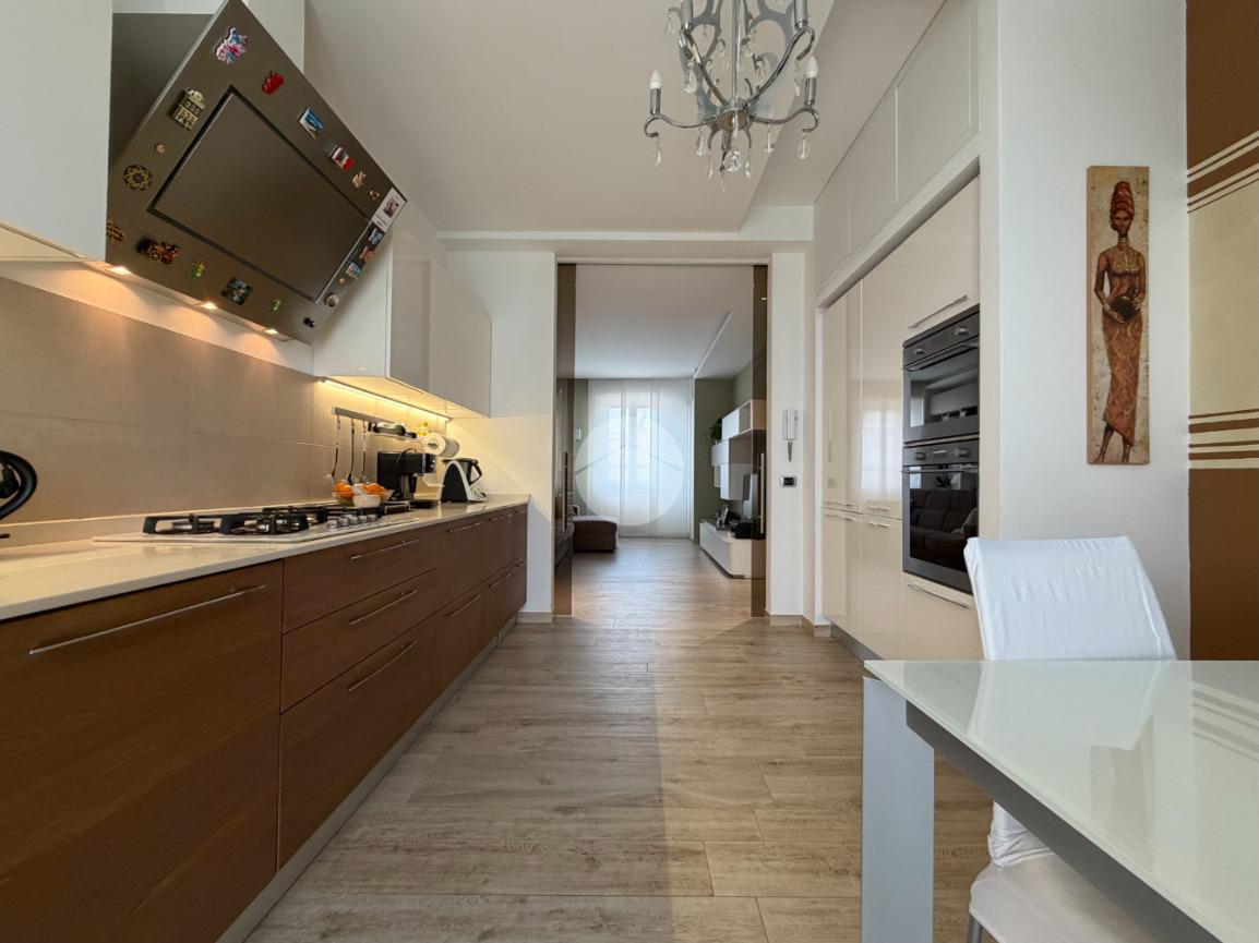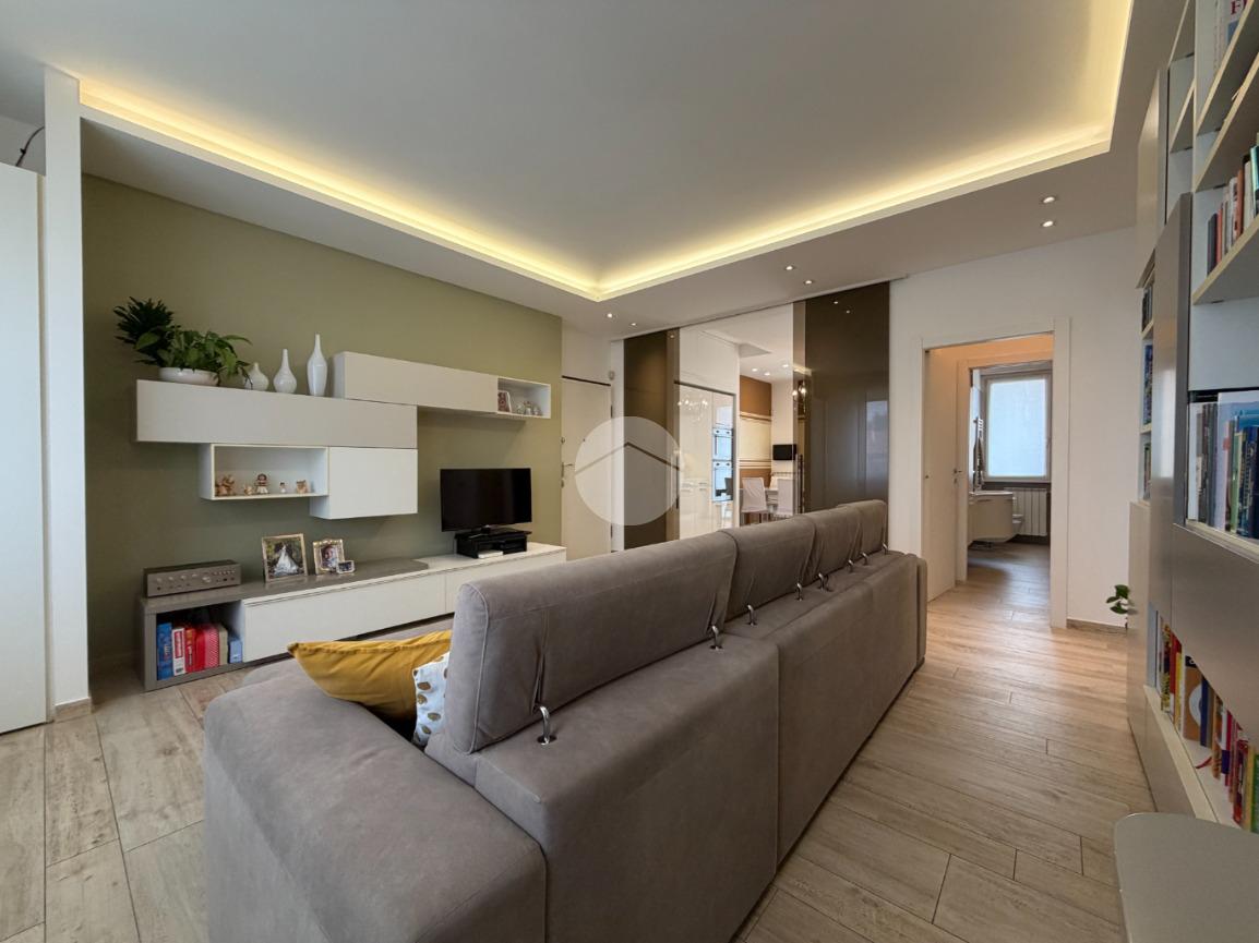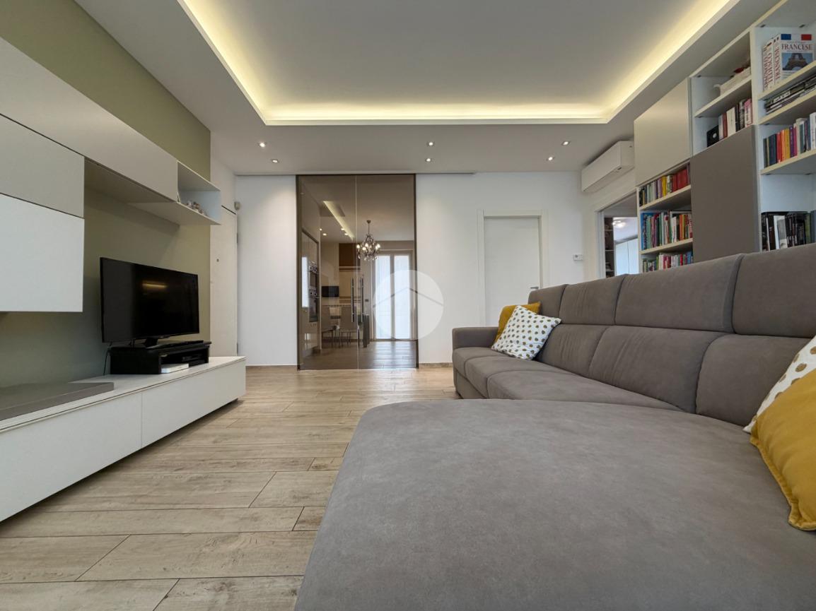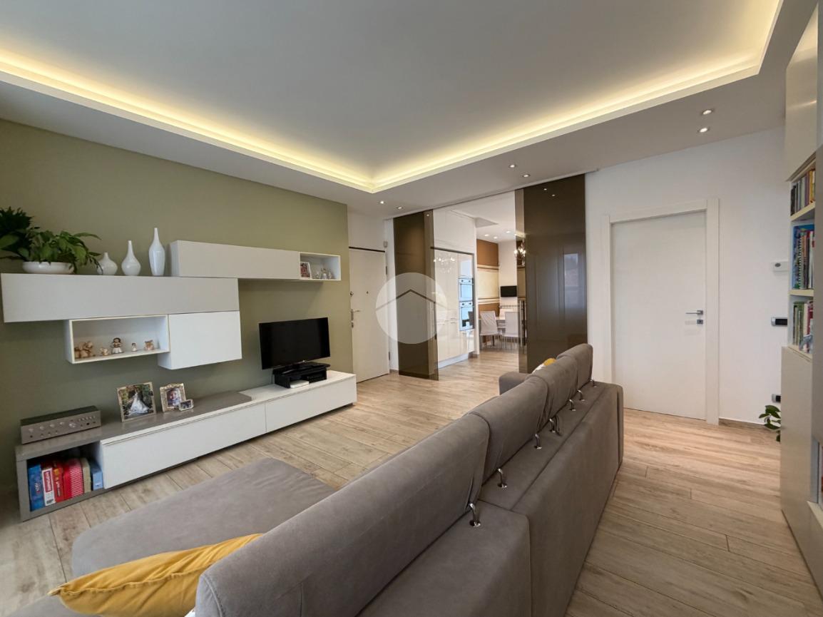 Proponiamo in vendita splendido appartamento di tre locali, recentemente ristrutturato e mantenuto in condizioni impeccabili grazie alla cura dei proprietari. L’ingresso si apre su un comodo e luminoso soggiorno, collegato a una cucina abitabile di ampie dimensioni, separata da una doppia porta in vetro fumé che divide elegantemente gli ambienti mantenendo al tempo stesso continuità e luminosità. La zona notte è composta da due camere matrimoniali e doppi servizi entrambi finestrati: uno dotato di doccia e l’altro con vasca e doccia. È presente inoltre un pratico antibagno sfruttato con armadiatura, ideale come spazio ripostiglio. Dalla cucina e da una delle camere si accede a un comodo balcone, mentre dalla camera matrimoniale si accede anche a un ulteriore balcone privato. L’appartamento si presenta in ottime condizioni, grazie a una recente ristrutturazione interna e a finiture moderne come pavimentazione in grès porcellanato effetto parquet, porte interne in legno sbiancato extra capitolato, infissi in PVC con doppio vetro, zanzariere e inferriate, tapparelle motorizzate in alluminio su tutte le finestre, impianto di antifurto e aria condizionata con pompa di calore. Gli alti soffitti sono valorizzati da eleganti abbassamenti in cartongesso che, oltre a dare carattere agli ambienti, permettono una gestione personalizzata dell’illuminazione e creano una moderna veletta per il binario delle tende. I bagni sono rifiniti con materiali di qualità e dotati di box doccia in cristallo da 10 mm marca Vismara. La casa è stata progettata in modo funzionale e razionale, così da sfruttare al meglio ogni spazio, e si presenta tenuta in modo impeccabile. Completano la proprietà una cantina, oltre alla quota di comproprietà con i restanti condomini del fabbricato sia di ampi locali comuni posti al piano sottotetto sia al piano seminterrato