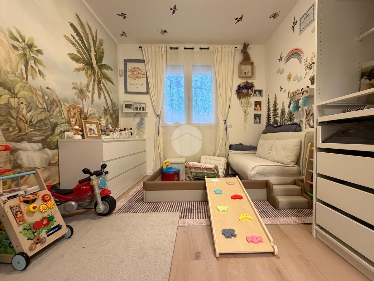 L’abitazione si apre su un’ampia e luminosa zona giorno, composta da cucina con bancone all’americana e una confortevole area relax con grande divano. Una vetrata scorrevole di generose dimensioni conduce direttamente al portico coperto e al giardino privato, curato e ben sfruttabile, che circonda la casa su due lati.