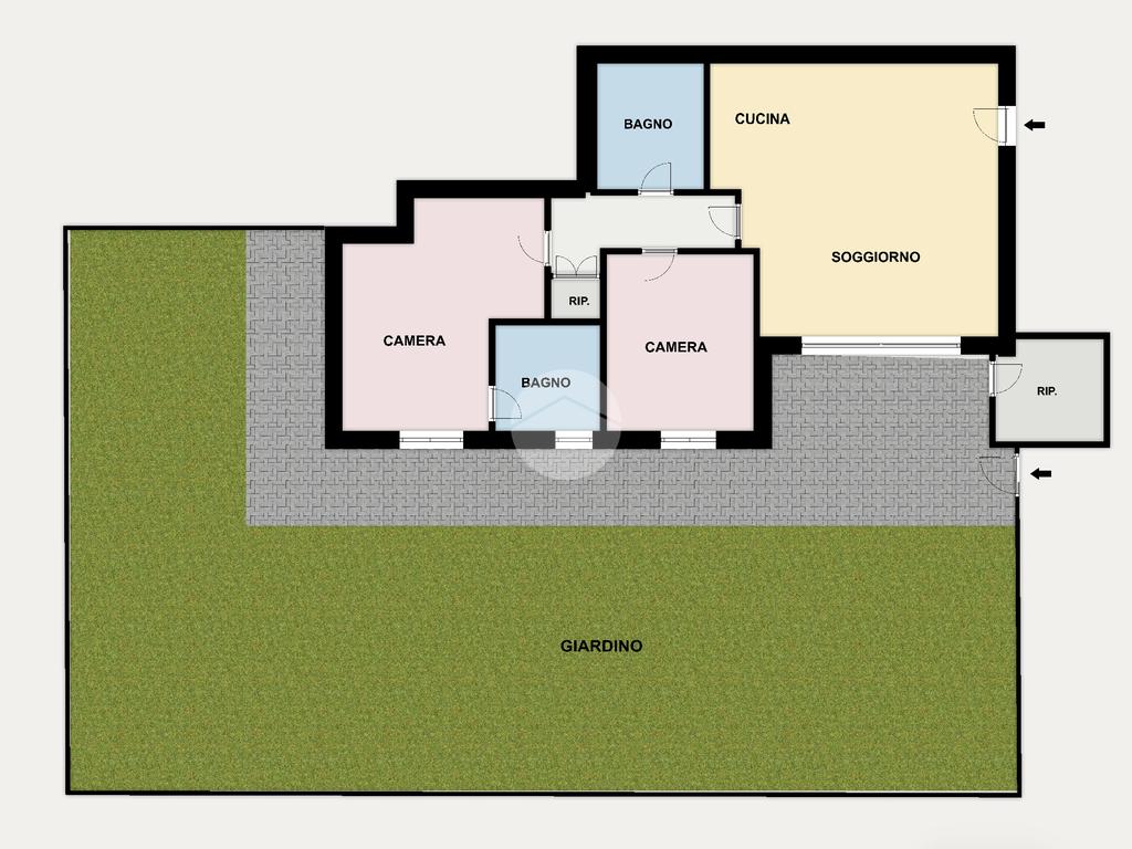 La proprietà gode di doppio accesso: dal pianerottolo condominiale e direttamente dal cancelletto privato del giardino.