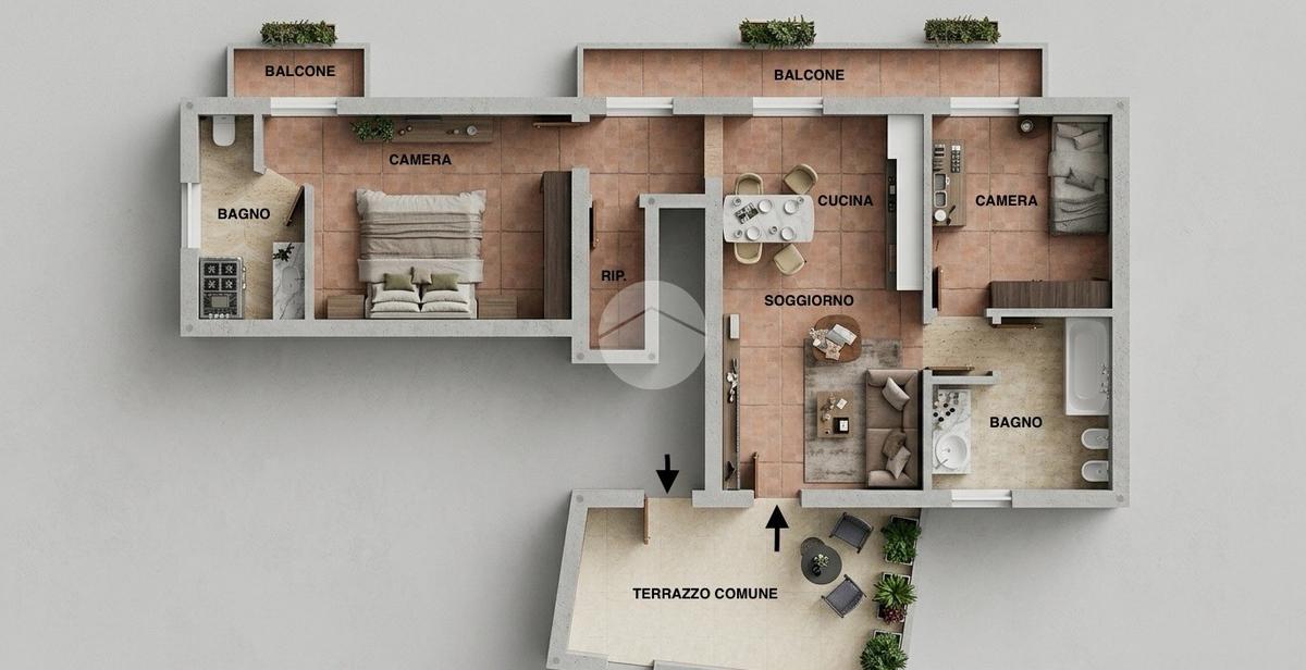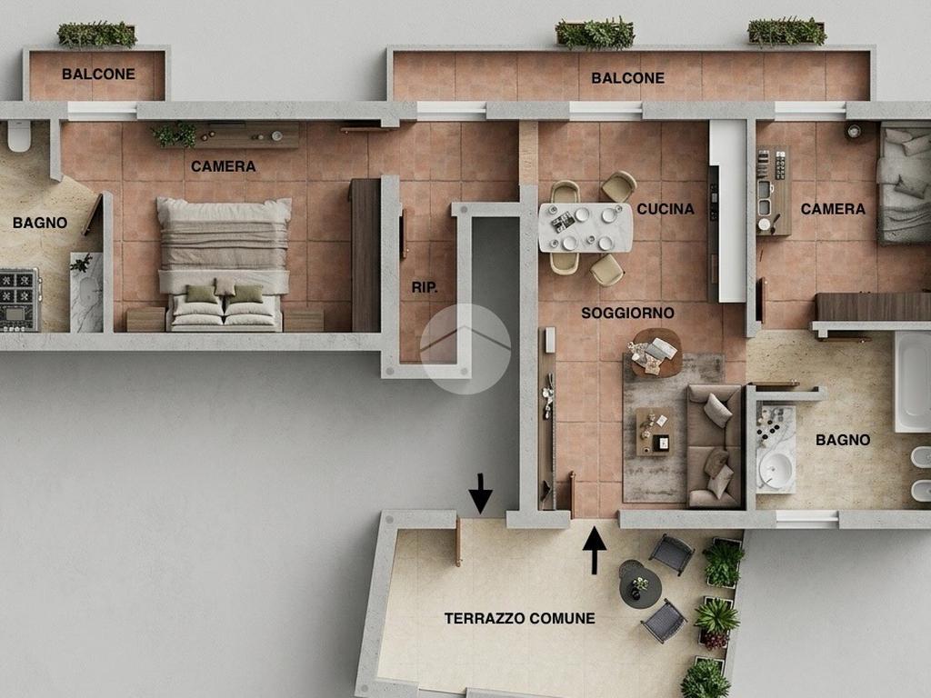 A completare la soluzione troviamo un pratico ripostiglio e un’ottima esposizione esterna: sia il soggiorno che entrambe le camere hanno accesso a un balcone, mentre la camera matrimoniale gode anche di un balcone esclusivo.