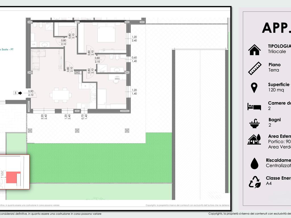 La zona giorno affaccia su un portico di circa 90 mq e su un giardino privato di circa 60 mq, ideali per vivere momenti di relax all’aria aperta.