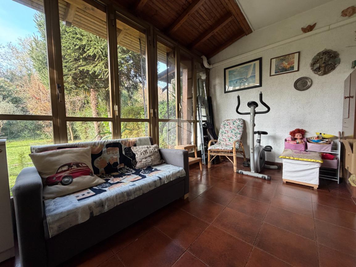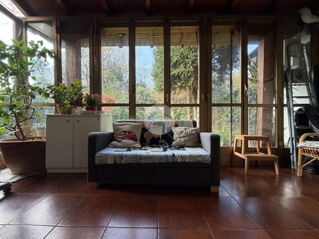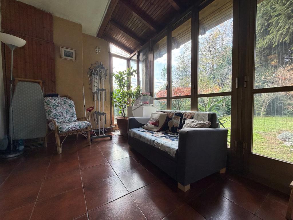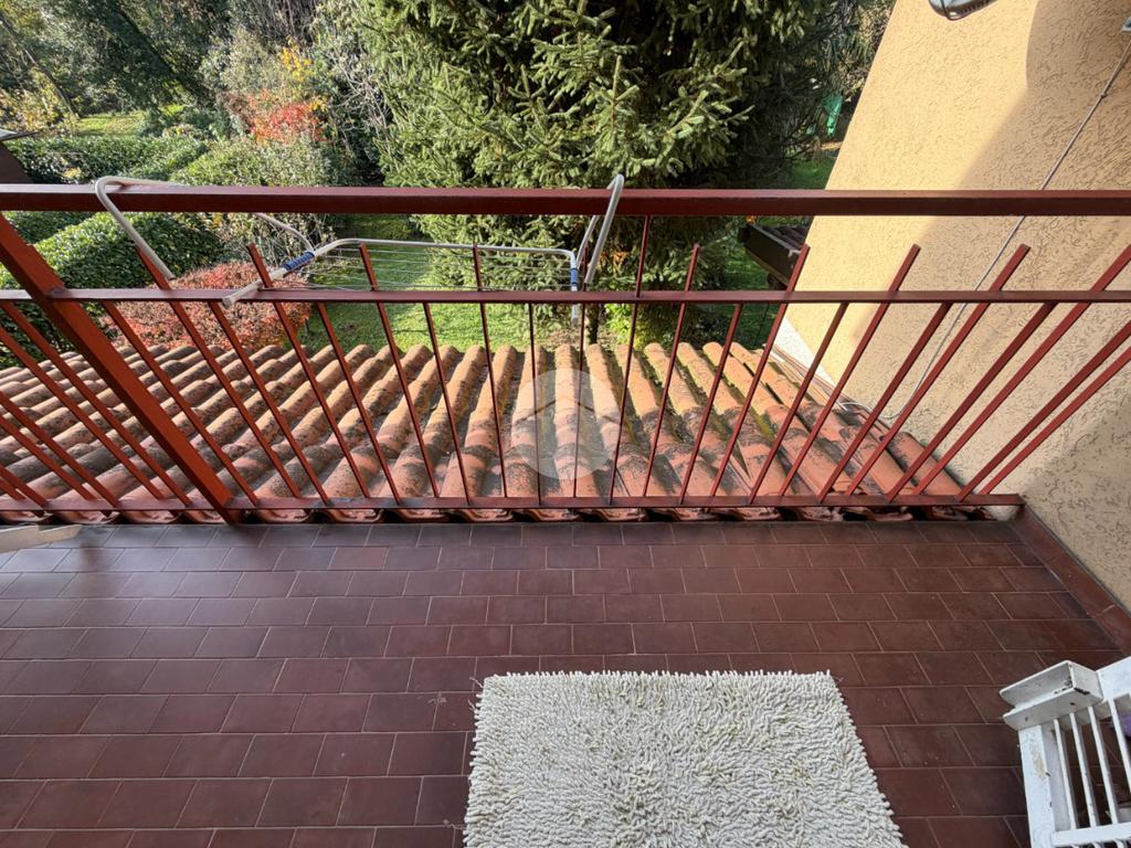 L’abitazione si apre da un balcone d’ingresso che conduce a un ampio soggiorno luminoso, dotato di accesso diretto a una veranda coperta e al giardino di proprietà, ideale per pranzi e momenti di relax all’aperto.